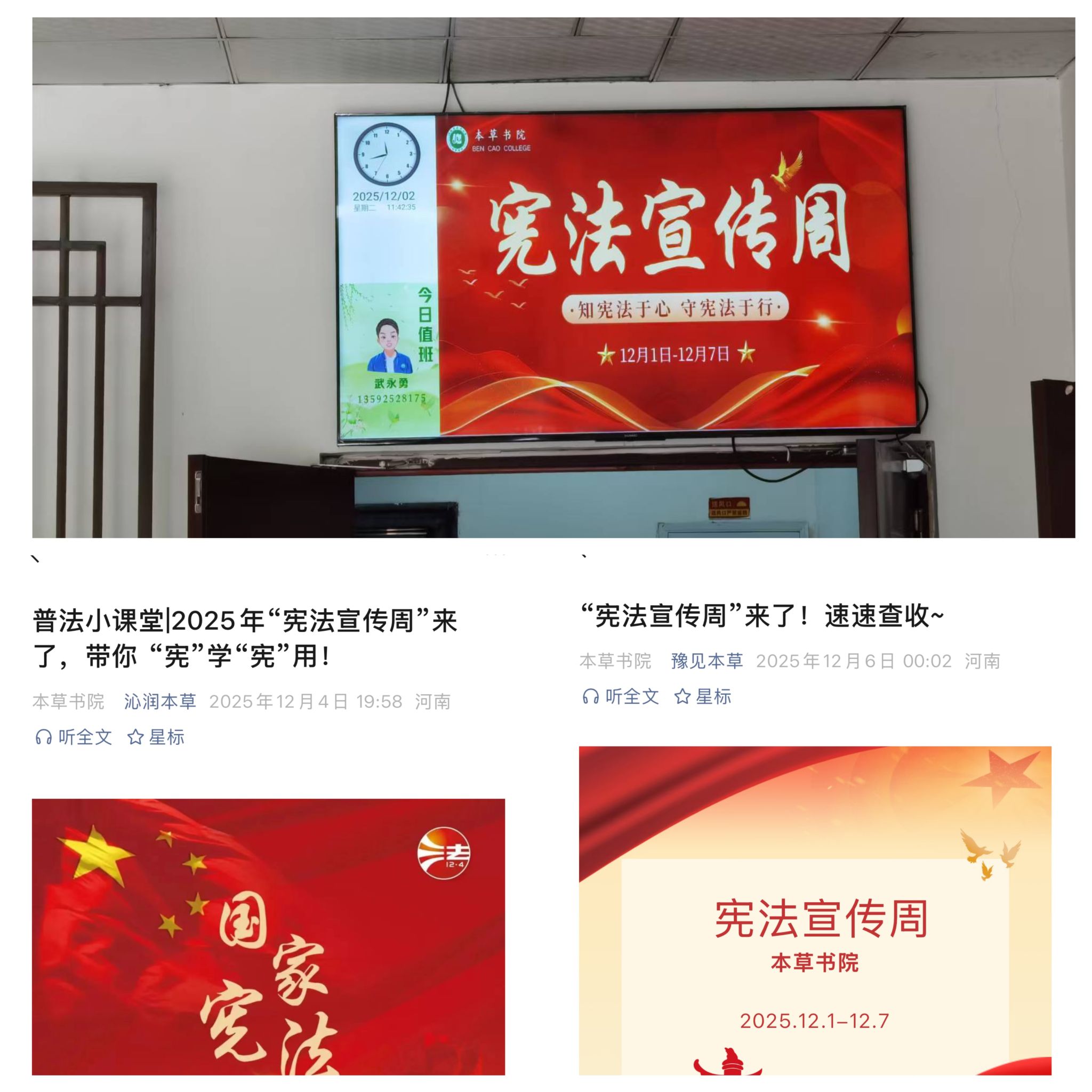书院创新教育形式,以多维度举措实现宪法宣传线上线下全覆盖。以班会形式为基础阵地,育人导师深入班级,结合中医药专业特色,解读宪法文化传承、公民健康权益等相关内容,让抽象法律条文与专业学习紧密结合。线上依托融媒体矩阵,持续发布宪法解读推文及普法短视频;线下通过社区宣传栏、智慧大屏展示宪法知识海报,营造沉浸式学习氛围,确保宣传广覆盖,有成效。